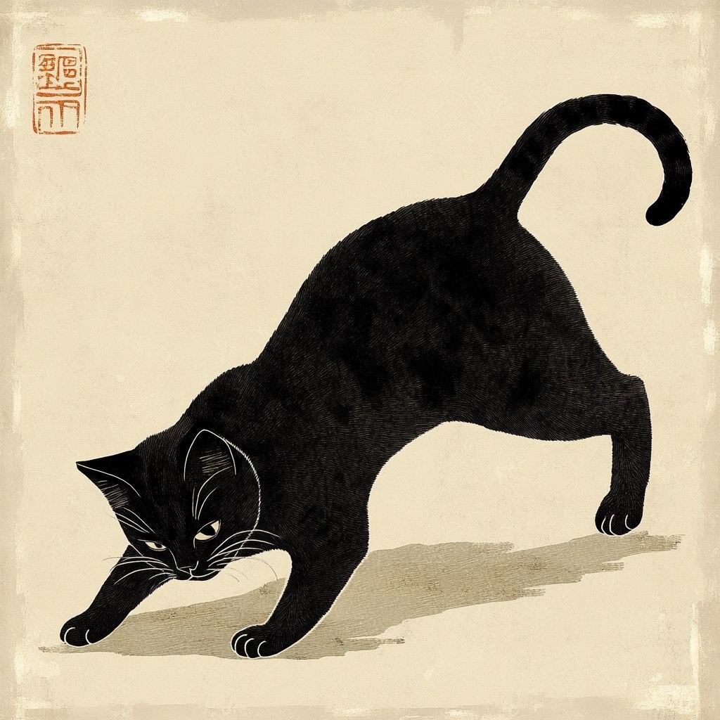 Создано на основе запроса: A full-body black cat stretching in traditional Japanese ukiyo-e style, woodblock print texture, Edo period