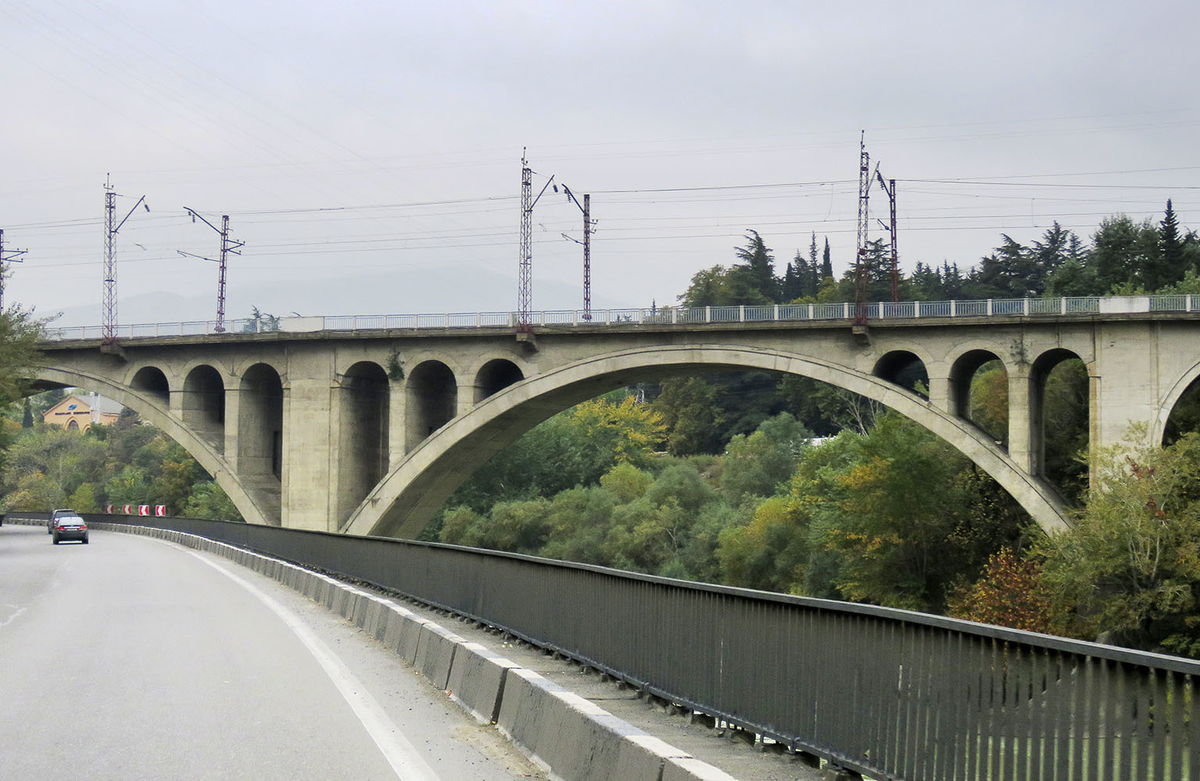 На мрачном грязном тбилисском автовокзале Дидубе, где натурально проваливаешься в самые лихие 1990-е с напёрсточниками, карманниками и токсикоманами, за нами долго-долго бегал таксист, предлагавший то ли за 100, то ли за 80, то ли за 60 лари экскурсию на храм Джвари. Таксисты часто берут измором, поэтому мы прыгнули от него в первую уходившую в сторону Мцхеты маршрутку, и вот уже продирались в ней сквозь пробки бескрайних жилмассивов Дигоми. В сущности, Тбилиси и Мцхета почти срослись - ещё не как Москва и Химки, но примерно как Екатеринбург и Верхняя Пышма или Мурманск и Кола, и тот же Джвари лишь исторически ассоциируется с Мцхетой, а вот логистически - скорее дальняя окраина столицы. Дорога вдоль Куры минует последний в черте Тбилиси мост - железнодорожный, по виду 1930-х годов: На том берегу лежит самый дальний тбилисский район Загэси, в котором даже не сразу считываешь простое советское "за ГЭС". Собственно, вот она, за рекой на конце длинного канала: Кура серьёзная река, в Зака