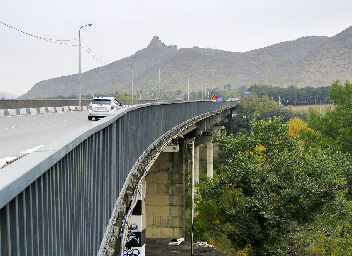 Хотя исторически храм Джвари относится к Мцхете, логистически это скорее самая дальняя точка Тбилиси. Удобнее всего туда было бы ехать из далёкого района Загэси (от Земо-Авчалинской ГЭС). Но добирались мы туда по высокому мосту автобана, за Мцхетой распадающегося на трассы до российской и турецкой границ, иначе говоря - к большей части мира. Храм будто совсем рядом, но на самом деле до него 7 километров серпантина и набор высоты метров 300.