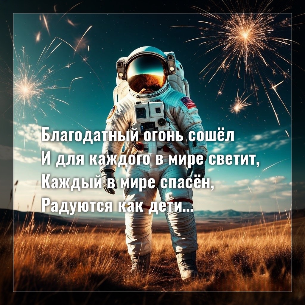 Благодатный огонь сошёл И для каждого в мире светит, Каждый в мире спасён, Радуются как дети, Воскресение даст всем шанс На исцеление мира, Каждый благословлён, У каждого возросли силы На преодоление преград, На прохождение пути, Света ещё стало больше, Бьётся огонь в груди, И разлилось тепло, Всё вокруг согревающее, Исцеление льётся, любовь Безусловная, всепрощающая. Удивителен этот мир, Особенно мир чудес, Пусть каждый внутри ощутит Объятие светлых Небес!