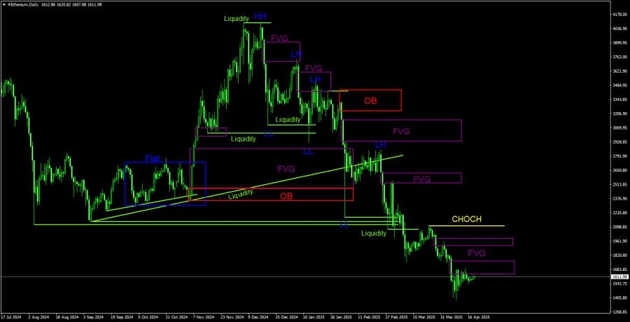 https://basechop.ru/wordpress/?p=39238 Эфир еле-еле восстановился к ближайшему FVG, и на этом его силы закончились. Если биткоин уже несколько дней находится во флэте, то чего ожидать от эфира? Как видим, падение продолжается уже 4 полных месяца, за которые эфир потерял больше 60% стоимости. Так как нисходящий тренд сохраняется, то ничего, кроме продолжения падения, ожидать сейчас просто нецелесообразно. Конечно, рано или поздно тренд завершится, но сейчас любое новое падение биткоина(а потенциал падения у него имеется) спровоцирует новый обвал эфира. Если ближайший FVG на дневном ТФ будет проигнорирован и отменен, тогда появятся первые признаки, если не разворота тренда, то хотя бы более или менее сильной коррекции. Однако напоминаем, что судьба эфира находится в руках биткоина. Если биткоин возобновит падение, то и эфир будет падать, какие бы паттерны по нему не формировались. Биткоин же сохраняет отличные шансы на продолжение падения, так как ближайший «медвежий» FVG сдерживает ег
