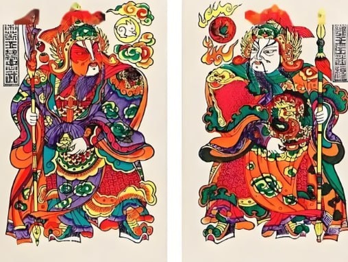Защитники дверей Шэнь Шу и Юй Лэй По легенде, в давние времена, в Восточном море на горе До Шо росло большое персиковое дерево, етви которого «вьются и изгибаются на 3000 ли. А самые нижние вытянулись на северо-восток, где создали проход для призраков (гуймэнь). По нему в мир людей приходили толпы темных духов. Этот проход были призваны охранять два духа Шэнь Шу и Юй Лэй. Они задерживали призраков, которые были намерены вредить людям, связывали тростниковой верёвкой и бросали в зубы тиграм. Когда об этом узнал император Хуанди, он приказал нарисовать изображение хранителей на табличках из персикового дерева (амулеты таофу) и развесить их на дверях, чтобы они оберегали дома от темных сил. Постепенно таблички заменили цветными изображениями на бумагах. Защитники по традиции изображаются яркими и внушительными, с луками, стре