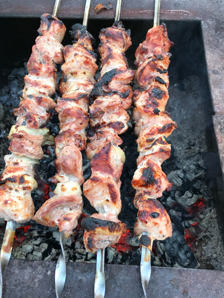 Поздравляю всех с праздником Светлой Пасхи. Христос Воскресе. Приближаются майские праздники. Выезд на дачу практически невозможен без шашлыка. Для приготовления используется свинина, говядина, телятина, баранина, курица и т.д. Специалисты посчитали: в 100 гр. куриного шашлыка от 130 до 160 ккал, в шашлыке из свинины 350 ккал, в шашлыке из говядины не менее 150 ккал. Остановлюсь на шашлыке из курицы, как менее калорийном продукте. Хотя, этот рецепт приготовления шашлыка использую для всех видов мяса. Обязательно надо использовать предпочитаемое мясо, лук, перец, соль. Для куриного шашлыка беру бескостное бедро с кожей. Кожа обязательно должна быть, т.к. при подгорании кожу можно снять и выбросить, не подгоревшую можно и употребить. Иногда использую бедро с костью и кожей. В этом случае мариную не менее 12 часов. В эмалированную посуду (кастрюлю, чашку, ведро, в зависимости от требуемого объема), на дно раскладываю первый слой куриного бедра. Обильно посыпаю резаным (не кольцами, а мелк