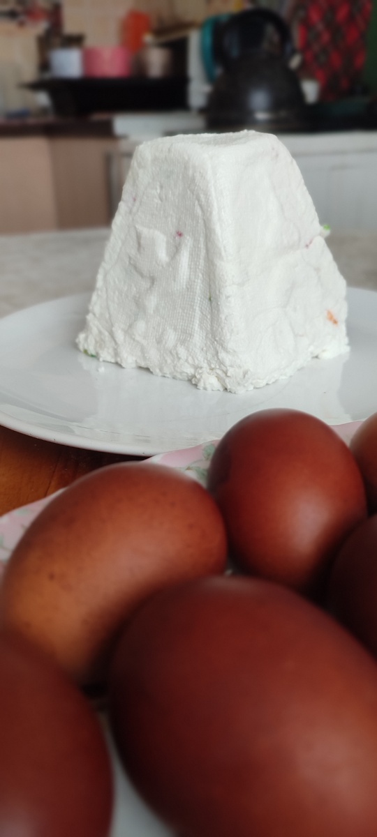 Доброго дня друзья, с праздником вас светлым! Давайте сделаем творожную Пасху, которую я делаю из года в год на праздник. Её можно готовить и просто так к чаю. Состав: -Творог 500 гр. (Жирность 5%) -Сметана 200 гр. (Жирность 15%) -Желатин 5 гр. -Ванильный сахар 10 гр. -Сахар полстакана. -Загуститель для сливок 10 грамм. -Цукаты 15 гр. Форма для Пасхи. Можно использовать тарелку, не имеет значения. Марля. Желательно не бинт, а большой кусочек. Соединяются творог, сметана, желатин (предварительно кипячу в воде и этот сироп выливаю), ванильный сахар, обычный сахар. Всё мешаем миксером. Потом добавляем цукаты. Застилаем форму марлей и ложкой придерживая марлю, перекладываем творожный десерт. Груз никакой не ставлю. Но можете накрыть тарелкой и поставить. Так всё вытекает и пасха суховатая для меня. Поэтому я просто ставлю в холодильник на 12 часов. Проходит время. Вытаскиваю, снимаю форму, марлю. Пасха готова. С праздником! Есть рецепты со сливочным маслом, если вы
