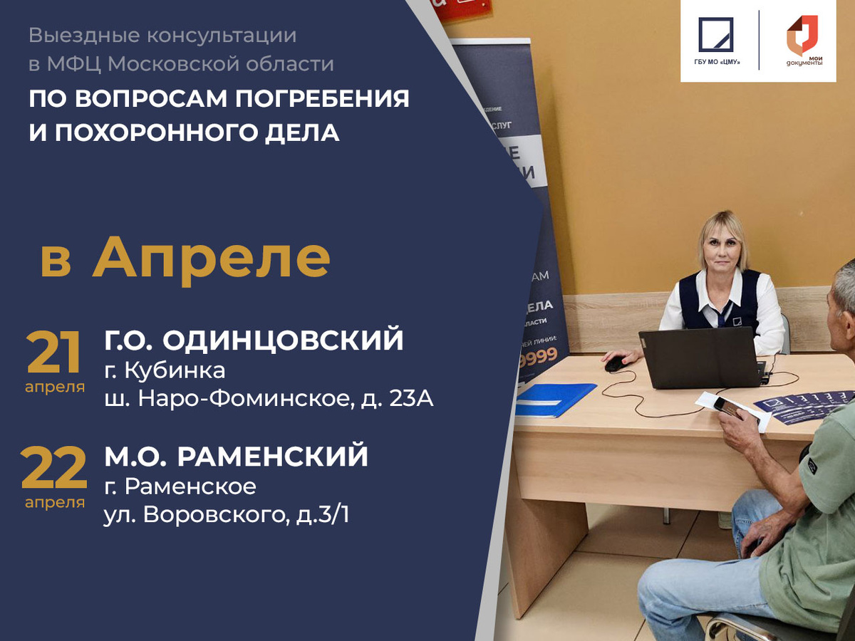 Спешите получить консультацию в МФЦ вашего города, согласно графику выездов, от специалистов ГБУ МО «Центр мемориальных услуг». Если вы хотите узнать о законодательстве в сфере погребения и похоронного дела - приходите в МФЦ на консультацию. Наши специалисты ответят на все интересующие вас вопросы.