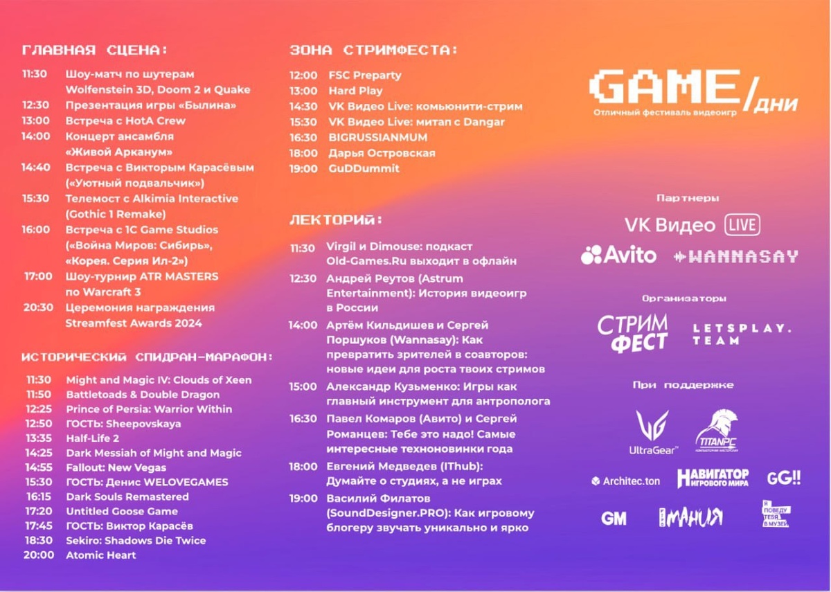 Мы на GAMEДНИ 2025 Подключайся к трансляции c 12:00! Задавай вопросы стримерам в прямом эфире! 12:00 - стримеры [FSC] 13:00 - HARD PLAY 14:30 - VK Видео Live: комьюнити стрим 15:30 - VK Видео Live: митап с Dangar 16:30 - BIGRUSSIANMUM 18:00 - ТАК ОСТРО! Дарья Островская 19:00 - GuDDummit 20:30 - Streamfest Awards 2024 Трансляция на канале организатора [FSC]party - MaxManorn Трансляция ГЛАВНОЙ сцены фестиваля от VK - VKLive Трансляция зоны "СТРИМФЕСТ" от VK - VKLive/streamfest