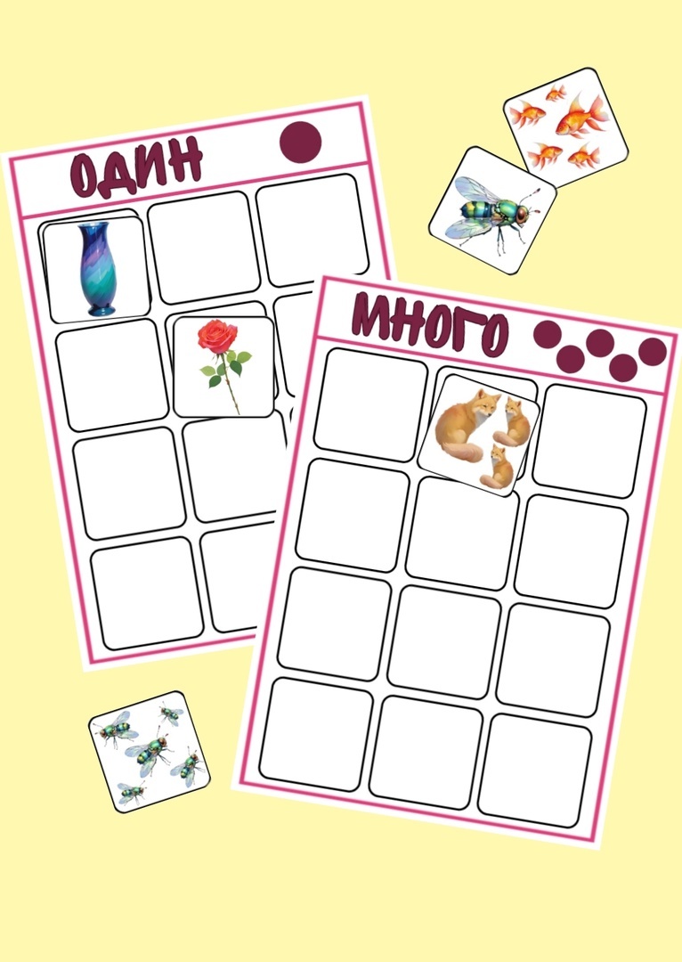 Цель игры: Отработка слов 1 типа слоговой структуры; образование существительных во множественном числе именительного падежа. Правила игры: Перед ребенком лежат 2 поля (один и много) и карточки. Необходимо разложить карточки на подходящие поля, называя их.