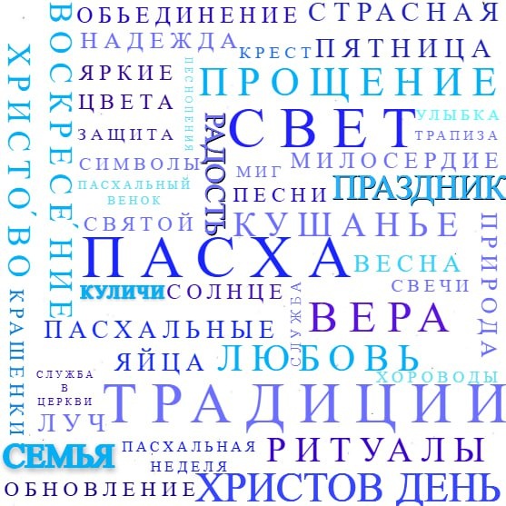 Пасха — это время обновления, света, надежды и радости. Для миллионов людей по всему миру этот праздник символизирует новую жизнь и духовное возрождение. В христианской традиции Пасха является торжеством веры и любви. А какое слово у вас ассоциируется с праздником Пасха. Пишите в комментариях.