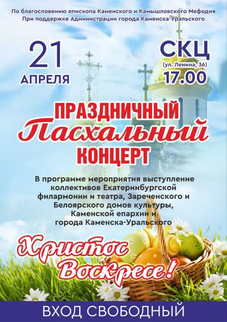 Приглашаем на праздничный Пасхальный концерт 21 апреля 2025 года по благословению епископа Каменского и Камышловского Мефодий в Социально-культурном центре города Каменска-Уральского (ул. Ленина, 36) состоится ежегодный концерт, посвященный празднику светлой Пасхи. Концерт пройдет при поддержке администрации города. Концерт проведут несравненный конферансье иерей Алесандр Горлов и прекрасная артистка Екатеринбургской филармонии Елена Руссу. Гостей и участников мероприятия поздравят с праздником епископ Каменский и Камышловский Мефодий и глава Каменска-Уральского городского округа Герасимов Алексей Алексеевич. В концерте примут участие: 🔷Архиерейский хор Свято-Троицкого кафедрального собора г. Каменска-Уральского 🔷Лицо и голос Российской медной компании Дмитрий Раков 🔷Солист Екатеринбургской филармонии Пётр Степовик 🔷Артист Екатеринбургской оперы Илья Комаров-Голованов 🔷Член Союза писателей России Анна Каменская 🔷Директор Белоярского ДК Оксана Исакова 🔷Вокальный коллектив Бе