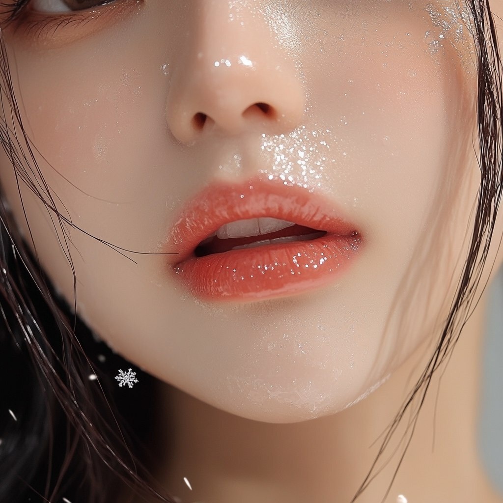 Создано на основе запроса: close up of a lip of a korean girl, wearing hydrated lip balm, lower lip partially cover with frost snow flakes