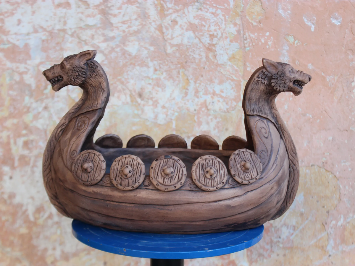 Сделал в начале года вот такую ладью-братину на заказ. Сделал четыре варианта, два не выжили - треснули при сушке. Всё таки сложно вылепить из комка такую большую форму, но ещё сложнее оказалось её правильно высушить.