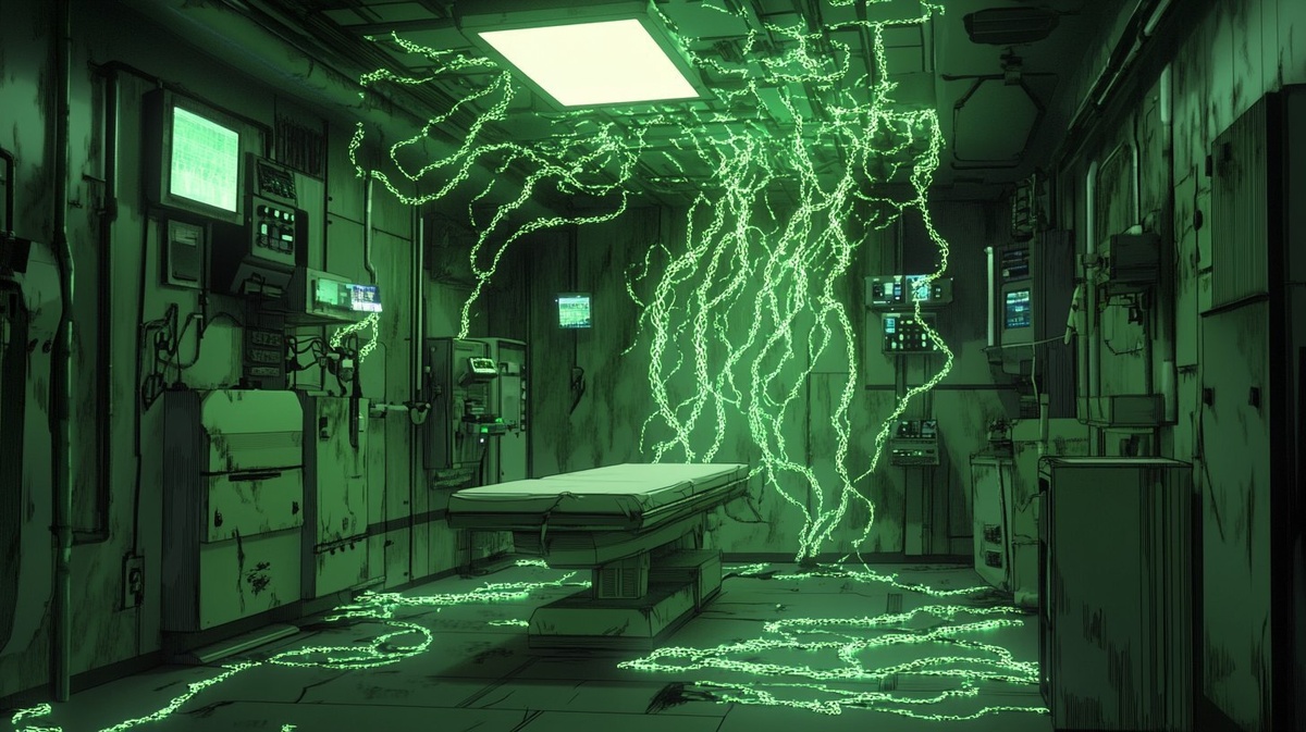 Создано на основе запроса: A wide establishing shot of a futuristic medbay interior, lit only by pulsating green bioluminescent tendrils stretching across the walls and conduits. The room is still and quiet, with soft flickering light reflecting off metallic surfaces. Tubing and panels line the walls, slightly worn and industrial, with a central examination table standing empty under a dim ceiling panel. The tendrils pulse rhythmically, faintly illuminating the dark corners, creating an eerie, alien atmosphere. Style mimics 90s sci-fi animation, with moody cinematic shadows and soft ambient haze. No characters present. Slow dolly-in.