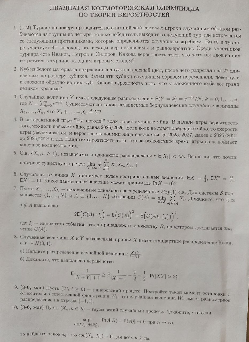 XX Колмогоровская студенческая олимпиада по теории вероятностей, организуемая кафедрой теории вероятностей механико-математического