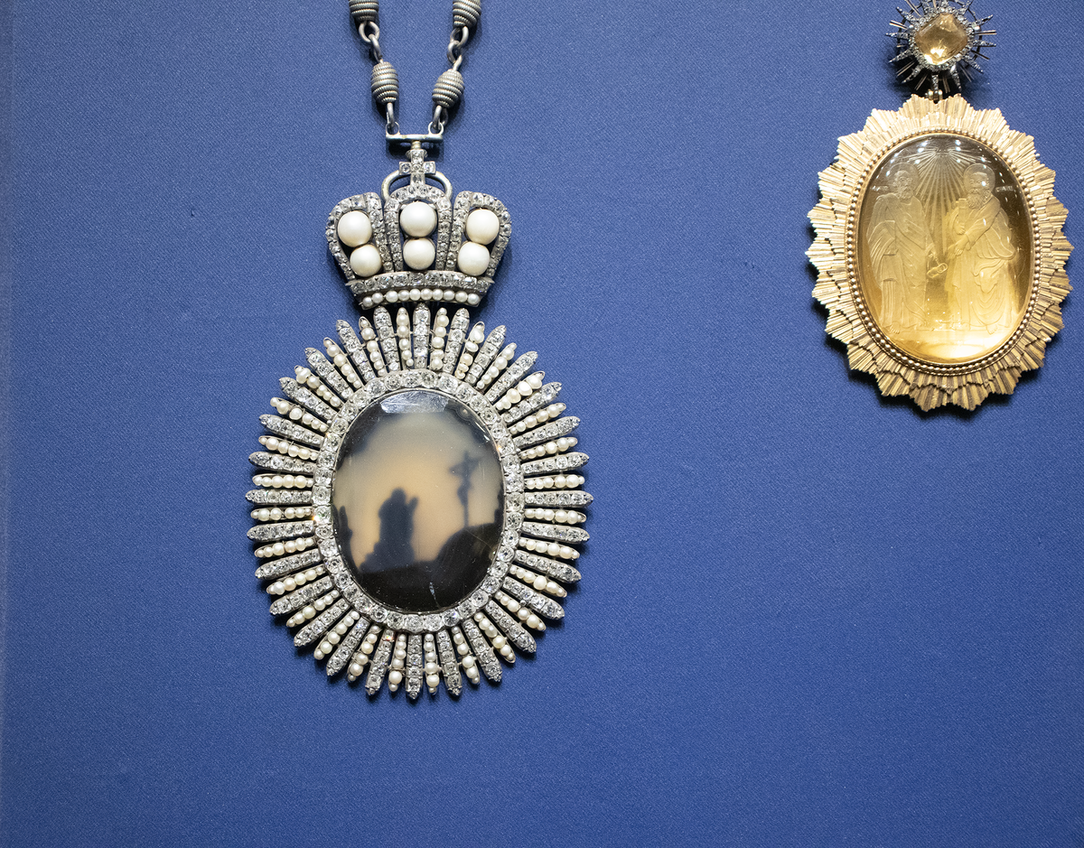 - Обязательно обратите внимание вот на эту панагию. Главное в ней совсем не бриллианты, которые использовали при отделке в XIX веке. Тут самое главное - камея из дымчатого агата. Изображение распятия и молящегося монаха на ней - нерукотворное. Это реально природный рисунок камня.