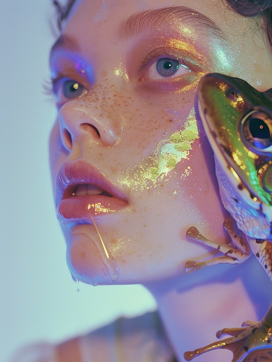 Создано на основе запроса: Close up of a princess with a big glossy frog near her face, The background is white studio wall. The overall tone is clean and high-fashion, futuristic but nostalgic and retro with a quiet intensity. Captured in soft, flat lighting, with low contrast. Shot in retro 90s Kodak Provia film style, inspired by Petra Collins, Namae Koi, and poetic fashion surrealism. --- Автоперевод: Крупный план принцессы с большой глянцевой лягушкой возле ее лица, фон - белая стена студии. Как тебе такая генерация? 🤔 https://dzen.ru/id/65c0c65c86e4f837c27b24d7 #ИИ #AI #нейросеть #midjourney #art