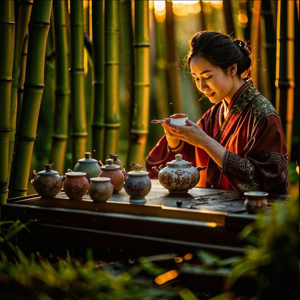 Чайная церемония в Китае прошла долгий путь от бытового чаепития до сложного философского ритуала. В разные эпохи она менялась, отражая религиозные взгляды, социальные нормы и эстетические идеалы. Чай сначала использовали как лекарство или жертвенный напиток (его подносили духам предков). В эпоху Хань (206 до н.э. – 220 н.э.) чай стали пить при дворе, но заваривали примитивно. Листья варили с имбирём, луком, апельсиновой коркой или даже рисом. Напоминал скорее суп или отвар, чем современный чай. Эпоха Тан — "золотой век" китайского чая. Именно тогда чаепитие стало искусством, а не просто утолением жажды. Чай прессовали в брикеты, затем растирали в порошок (как позднее в японской чайной церемонии). Воду нагревали в котле, но не кипятили до пузырей — считалось, что "правильная вода" должна шуметь, как ветер в соснах. Чай взбивали бамбуковым венчиком, получая пену (как в матче). В VIII веке поэт и философ Лу Юй написал "Ча Цзин" (茶经, "Канон чая") — первый в мире трактат о чае. Он описал: