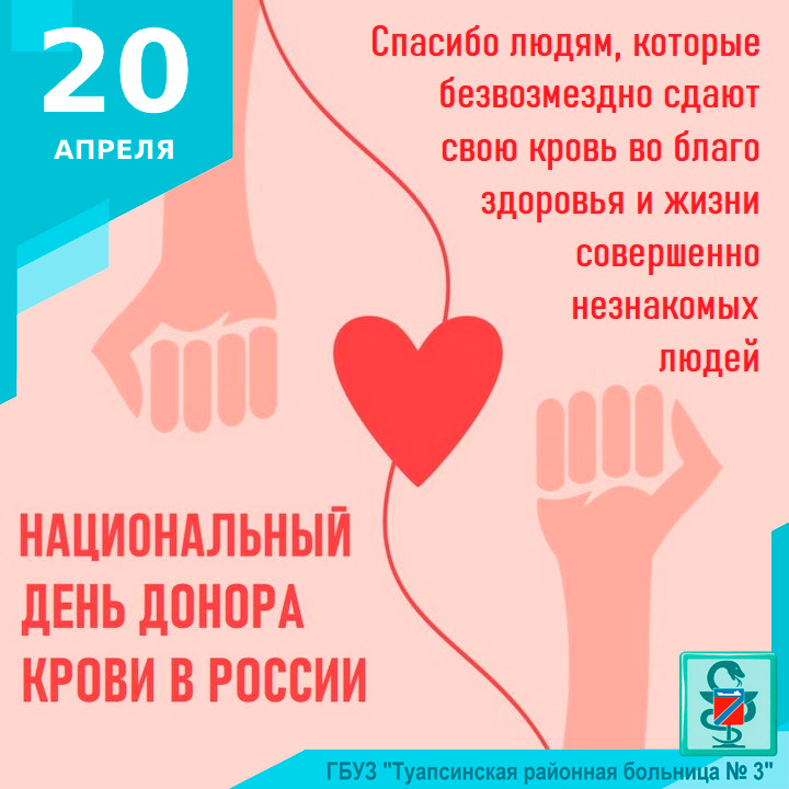 Сегодня отмечается один из важных социальных праздников — Национальный день донора России. Этот День посвящен, в первую очередь, самим донорам — людям, которые безвозмездно сдают свою кровь во благо здоровья и жизни совершенно незнакомых людей, а также врачам, которые проводят забор крови, контролируют санитарное состояние станций переливания крови, разрабатывают методики и аппаратуру, тщательно обследуют полученный материал. Всех доноров объединяет одно: готовность поделиться частичкой себя ради сохранения здоровья и жизни незнакомого больного, потребность сделать жизнь вокруг чуть-чуть лучше, желание помогать тем, кто в этом нуждается. Миллионы людей обязаны своей жизнью тем, кого они никогда не видели - донорам. Поздравляем всех доноров России с праздником, и СПАСИБО им за то, что когда-то сдавали и сдают кровь! Подробнее на нашем сайте https://hosp23.ru/medevents/369-dendonora.html