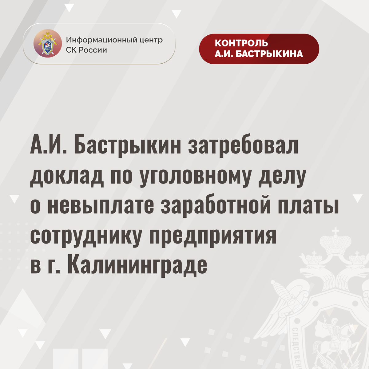 А.И. Бастрыкин затребовал доклад по уголовному делу о невыплате заработной платы сотруднику предприятия в г. Калининграде