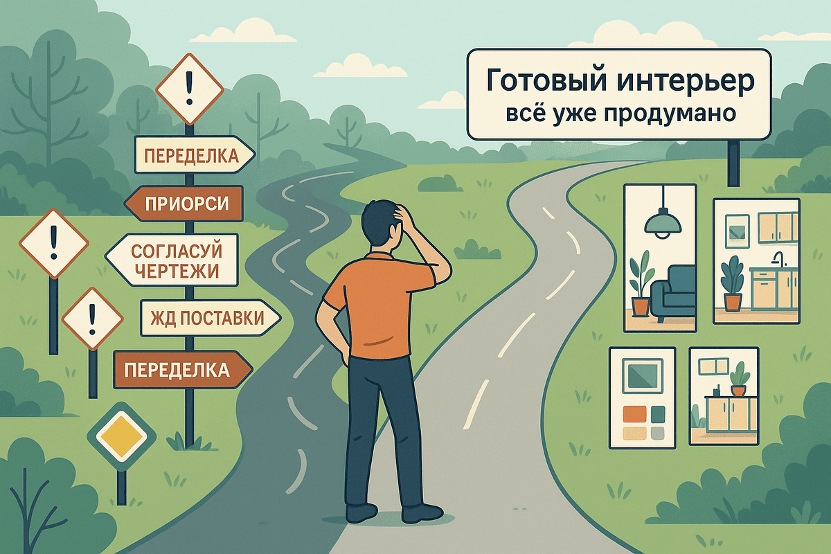 Индивидуальный проект требует времени: подбор стиля, утверждение планировок, визуализации, комплектация. Это может занять месяцы.