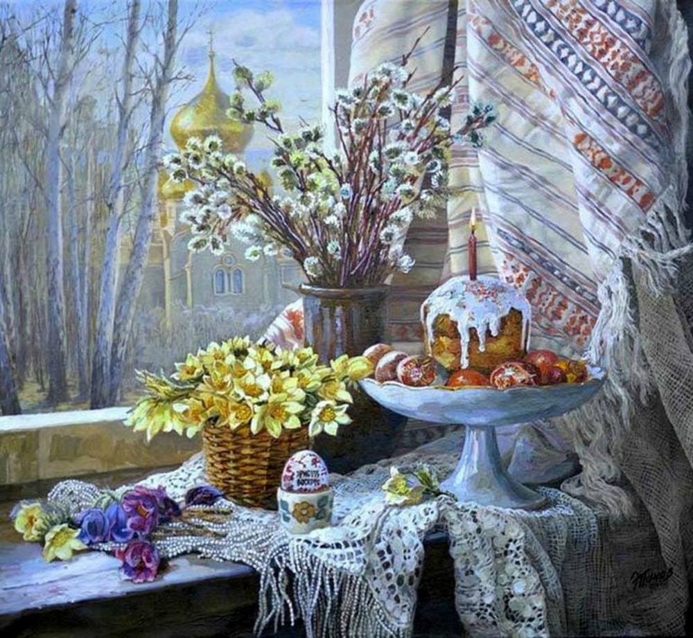 Игорь Северянин. В стихотворении «Пасха в Петербурге» 1926 года поэт из эмиграции возвращается в прошлое и вспоминает радость пасхальных дней в России. Гиацинтами пахло в столовой, Ветчиной, куличом и мадерой, Пахло вешнею Пасхой Христовой, Православною русскою верой. Пахло солнцем, оконною краской И лимоном от женского тела, Вдохновенно-веселою Пасхой, Что вокруг колокольно гудела. И у памятника Николая Перед самой Большою Морскою, Где была из торцов мостовая, Просмоленною пахло доскою. Из-за вымытых к Празднику стекол, Из-за рам без песка и без ваты Город топал, трезвонил и цокал, Целовался, восторгом объятый. Было сладко для чрева и духа. Юность мчалась, цветы приколовши. А у старцев, хотя было сухо, Шубы, вата в ушах и галоши… Поэтичность религии, где ты? Где поэзии религиозность? Все «бездельные» песни пропеты, «Деловая» отныне серьезность… Пусть нелепо, смешно, глуповато Было в годы мои молодые, Но зато было сердце объято Тем, что свойственно только России! Послушайте другие сти