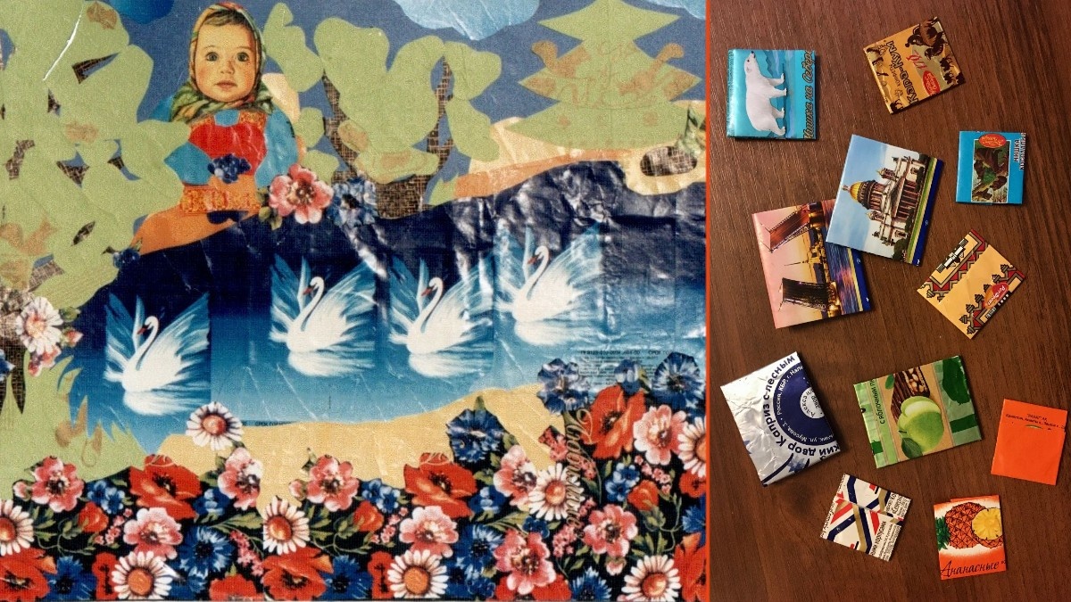 Яркие, красочные фантики на бумажной основе можно использовать в качестве материала для аппликаций. А если у вас дома собралось несколько малышей, устройте конкурс. Предложите детям создать свою картину из одинаковых наборов фантиков (достаточно 5-7 штук) и картонной основы. Уверена, вас поразит разнообразие вариантов, и проигравших не будет!