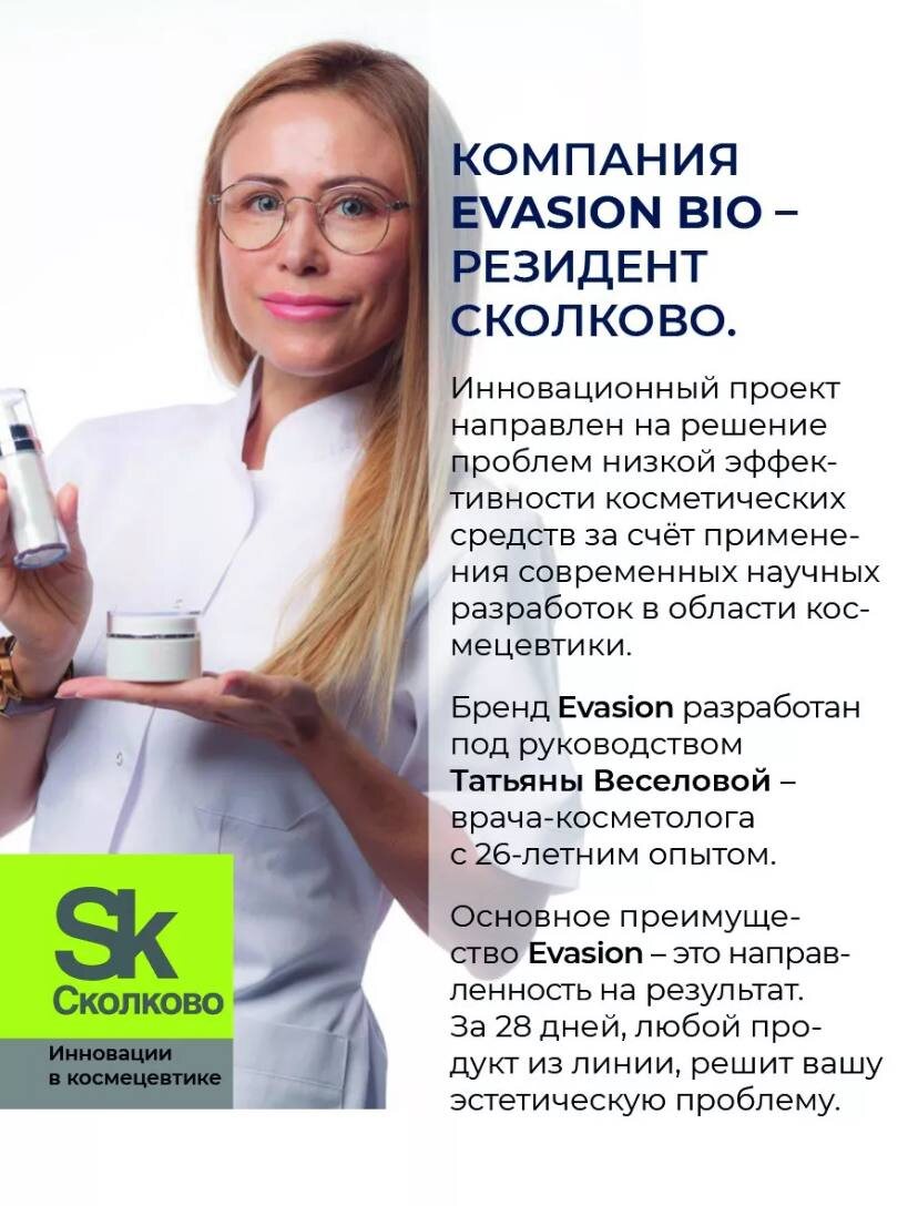 Это настоящая космецевтика для ухода за лицом, телом, волосами. EVASION резидент Сколково – инновационный проект, направленный на решение проблем низкой эффективности различных косметических средств, за счет применения самых современных научных разработок с клинической доказательной базой.
