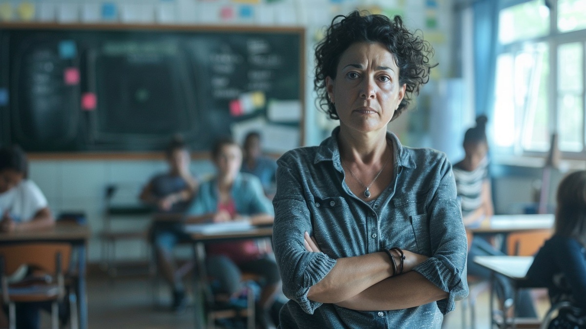 Создано на основе запроса: hyper-realistic photo of teacher facing the camera looking depressed standing facing her classroom