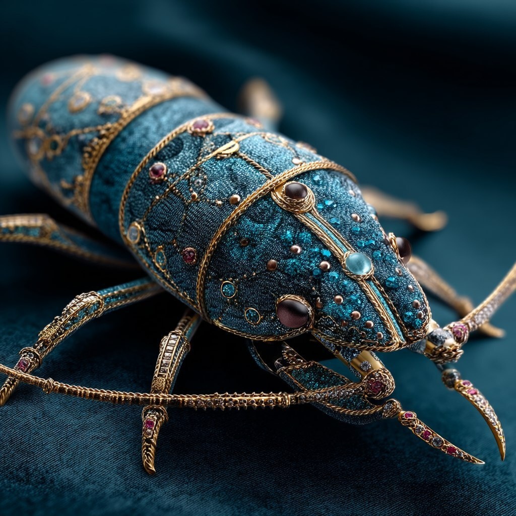 Создано на основе запроса: a finely crafted steampunk-inspired piece of jewellery in the shape of a crustacean. Finely crafted filigree gold and silver, set with small sparkling sapphires, diamonds and apatite stones, and tiny contrasting rubies. intricate sparkling details, Delicate, extremely valuable piece of jewellery from the noble house of Fabergé, low angle on a soft deep dark petrol velvet, mysterious low light, dark low key, noble shimmering surface --- Автоперевод: Тонко изготовленная в стиле стимпанк в форме ракообразного. Неплохо выглядит? 🤔 https://dzen.ru/id/65c0c65c86e4f837c27b24d7 #ИИ #AI #нейросеть #midjourney #art