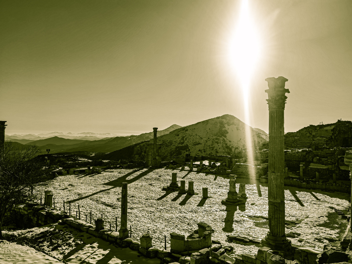 Весьма интересно смотреть это зимой. Нам обычно как грек-римляне представляются? Одеты в чём? А тут прям снег лежит, холодно. И не сказать, чтобы город был мелкий. Так ещё и был красиво украшен. Попробуй-доберись, донеси. Вон ниже современный Агласун живёт - и хорошо там.
