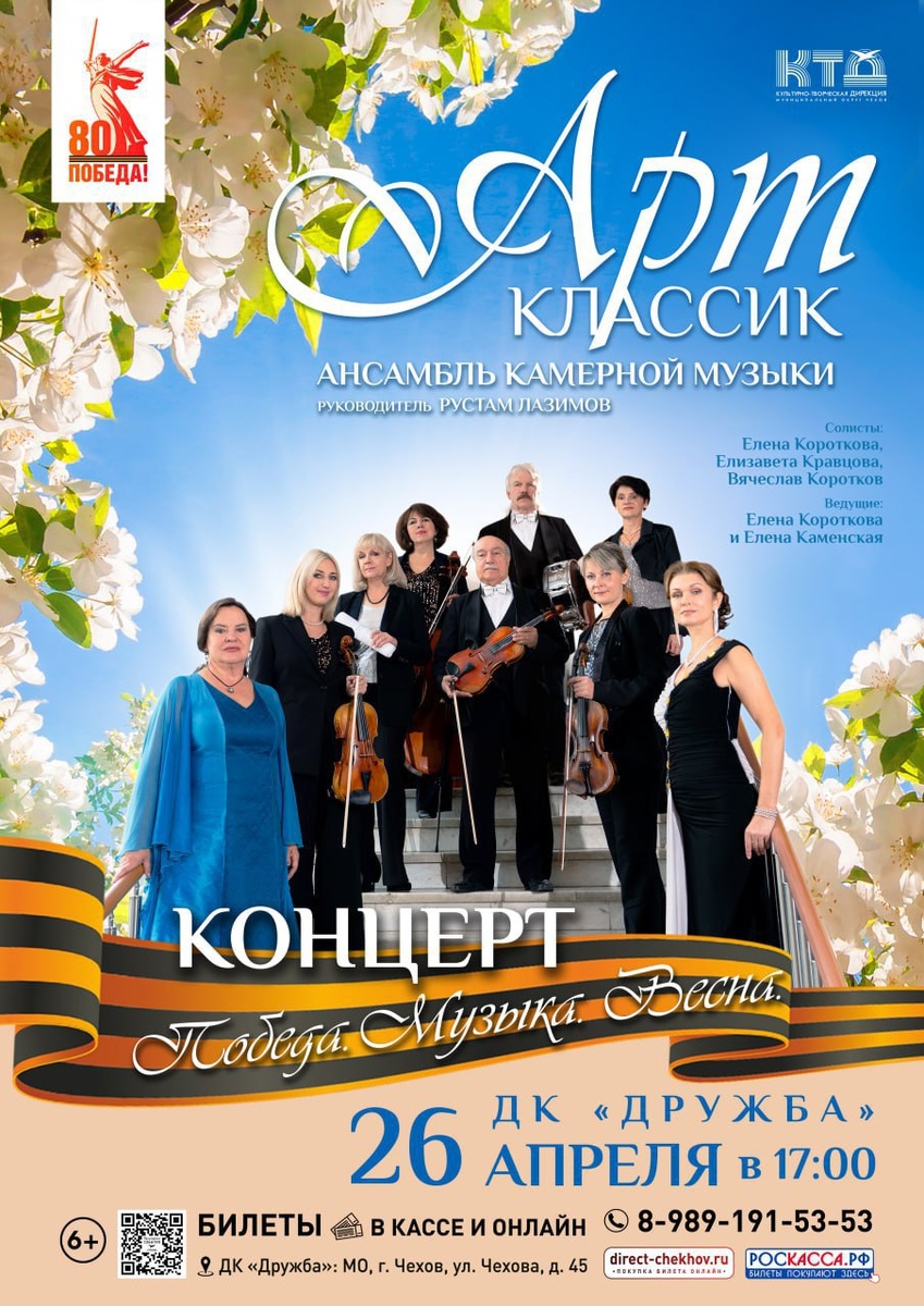 ✨ Праздничный концерт ансамбля камерной музыки «Арт- классик» - «Победа. Музыка. Весна» 🎶Вы услышите произведения, отражающие незабываемые страницы истории нашей страны. 🎤В программе принимают участие Елена Короткова, Елизавета Кравцова, Игорь Морозов и Елена Каменская. 🎟️Билеты в кассе ДК 🚫 Возраст: 6+ 📆 26.04.2025 🕛 17:00 🏢 ДК «Дружба» 📍 г. Чехов, ул. Чехова, д.45 💰 Цена от: 200 до 400 ₽ #webЧехов ✅ Мероприятия Чехов https://dzen.ru/id/66cc4b48e9ef144699238a51 http://vk.com/chekhov_events http://dzen.ru/chekhov_events