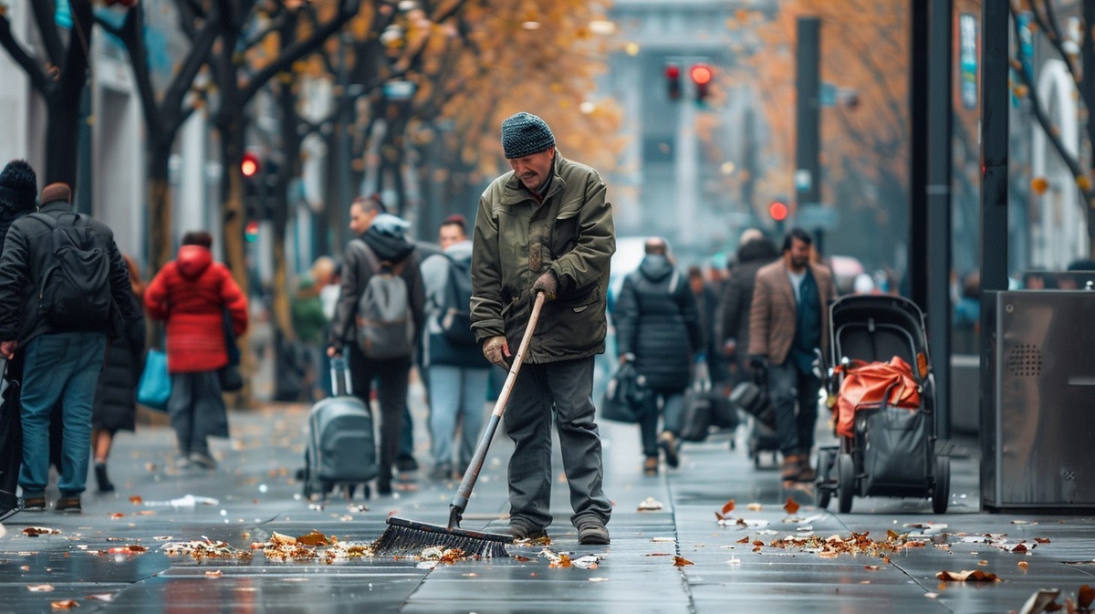 Создано на основе запроса: hyper-realistic photo of a street-cleaner worker sweeping the sidewalk looking depressed lots of ordinary people