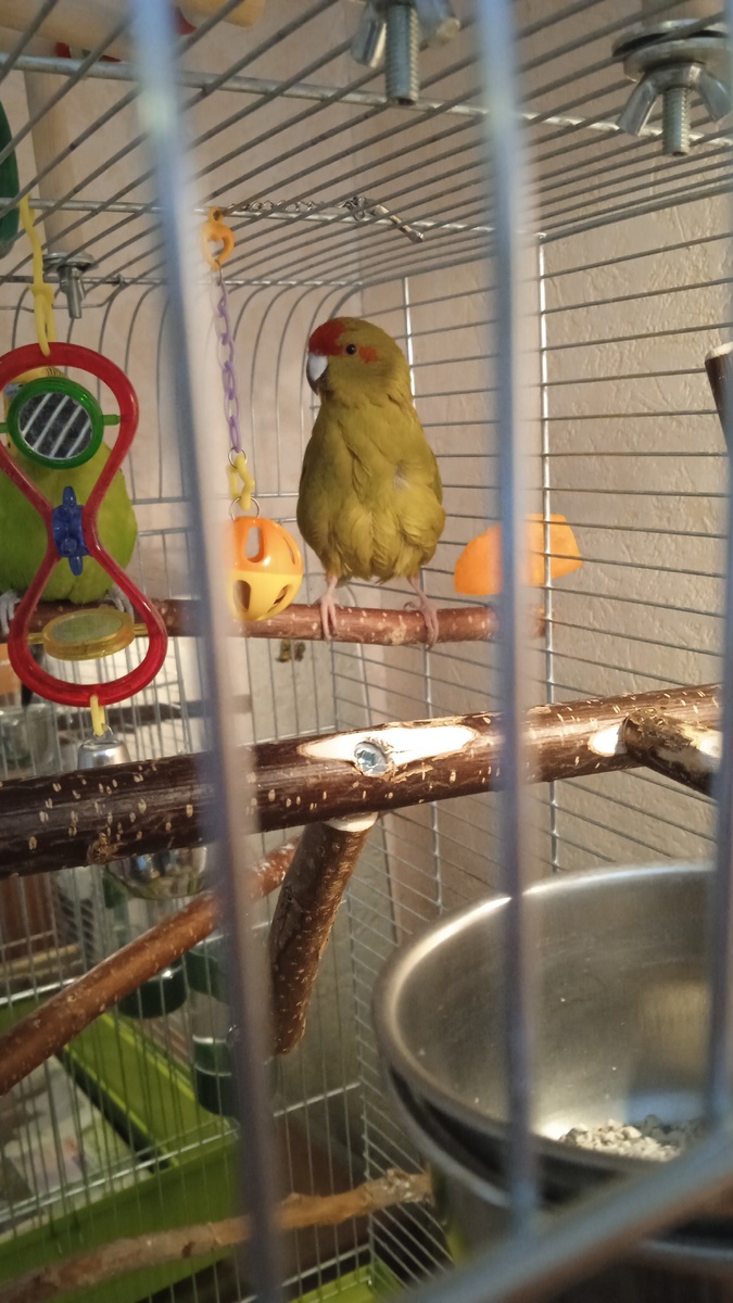Знакомьтесь, Корица В этом году мой день рождения совпал с Пасхой, что вдвойне радостно. Ну и вот, собственно, что я себе подарила. Попугая. Это девочка, какарик, зовут Корица. Наш волнистик в феврале овдовел, хотели сначала купить ему новую девочку, но купили тоже, конечно, девочку, но другого вида. Я приметила её еще в феврале, в зоомагазине, подумала, что хорошо бы... Ну и ходила, смотрела, сомневалась. А неделю назад пошла и купила. Она уже соседствовала с волнистиками, относится к ним хорошо, но наш Шурочка, попробовав с ней поцеловаться и не получив желаемого, стал с ней очень строг, даже чтоб рядом не возилась с ним, поэтому пришлось обустраивать каждому отдельное жильё. Не дерутся, но и не дружат, ходят друг к другу есть, а потом улетают. Корица, в отличие от своего пернатого соседа, любопытна и почти бесстрашна. Уже заваливалась за шкаф, спасали, везде полазила, потрогала. Говорят, что какарики не летают, наша же облеты по комнате делает регулярно, на второй д