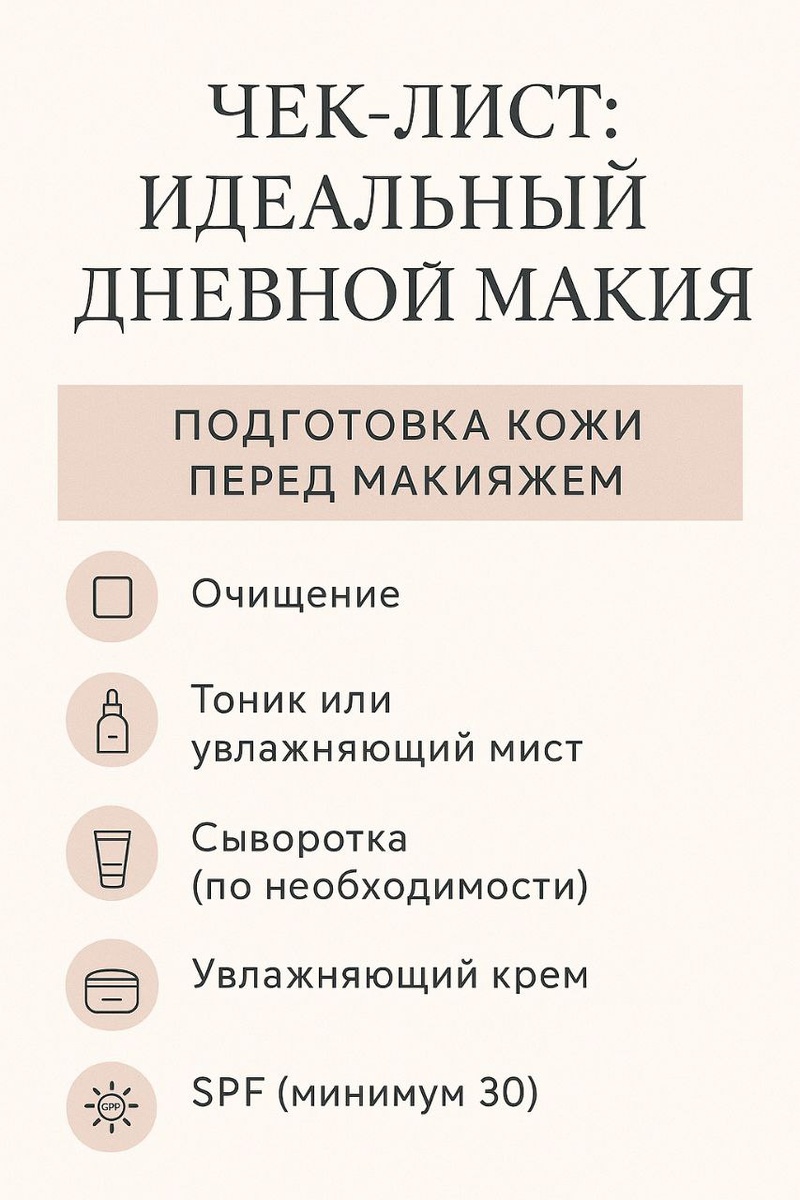 Идеальный макияж всегда начинается с качественного ухода. Именно от него зависит, насколько ровно ляжет тон, как долго продержится косметика и будет ли кожа выглядеть свежей в течение дня. Обязательно умываемся мягким средством. Даже если кожа кажется чистой, с поверхности нужно убрать себум, пыль и остатки ночного ухода. Тоник восстанавливает pH кожи и подготавливает её к нанесению последующих средств. Он может быть увлажняющим, успокаивающим или балансирующим — ориентируйтесь на тип кожи. Сыворотка — это дополнительный уход, который работает точечно: увлажнение, антипигментация, лифтинг и пр. Для макияжа отлично подойдут лёгкие текстуры с гиалуроновой кислотой или витамином С для сияния. Грамотная подготовка кожи и основа для идеального дневного макияжа.