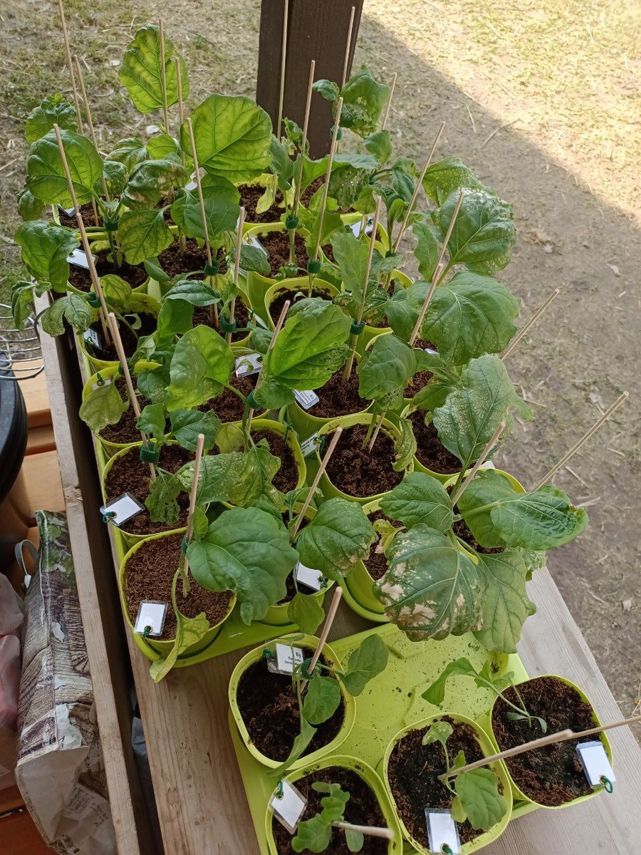 Баклажанам тоже показал, где их жизнь будет продолжаться. Что есть ветер, солнце и шмели. Всем установил подвязки, уже не держатся самостоятельно. Много повреждённых листьев. Пока не пойму, толь кальция мало, толь трипсы какие. Начну с подкормок, там и видно будет.