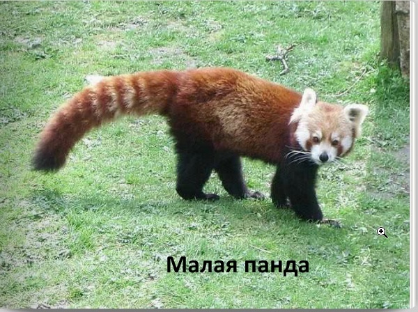 По размерам это сравнительно небольшой зверь: ростом немного крупнее кошки. Весит малая панда 4 -5 кг, а длина тела 50 – 60 см, да ещё очень пушистый полуметровый хвост. Зверёк очень красив. Густейший мех на спинке окрашен в яркий тёмно-рыжий цвет с золотистым отливом. Брюшко и ноги – густо-чёрные, а хвост рыжий с кольцеобразными светлыми полосками. На голове как будто красочная маска: рыжий лоб, темно-рыжие щечки и снежно-белые бакенбарды, кончики ушек и острая мордочка с маленькими темненькими глазками и подвижным носом. Лапки у малой панды короткие, на них большие полувтяжные когти, сбоку которых маленькая косточка – ложный палец, совсем как у большой панды и тоже помогает им удерживать ветки деревьев и стебли бамбука.