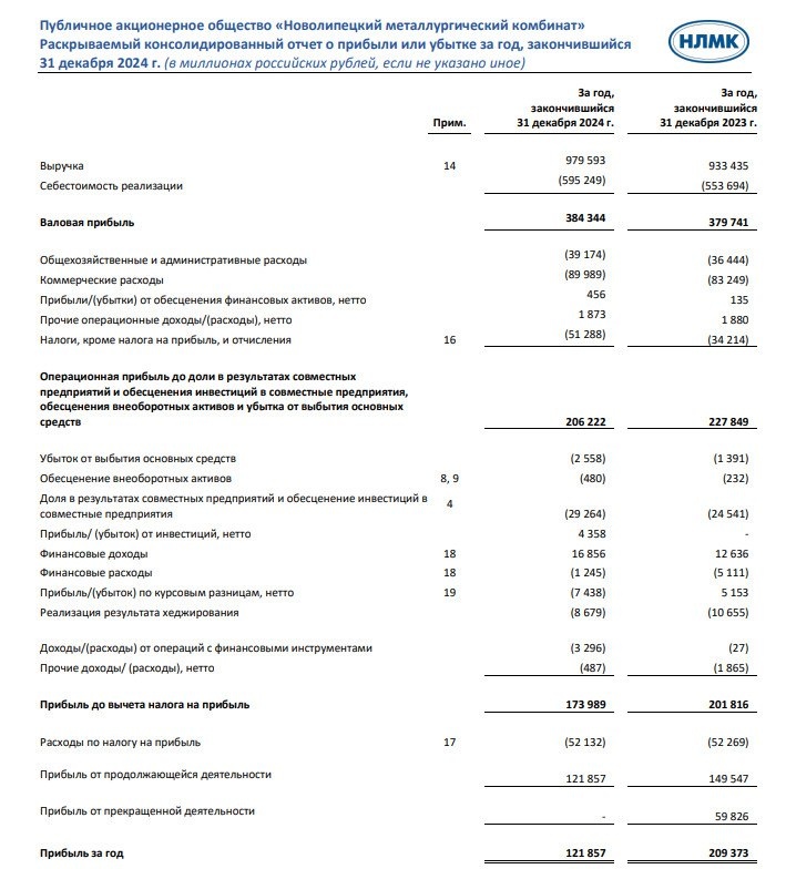 💿 Компания НЛМК опубликовала финансовый отчет по МСФО за 2024 год. 1️⃣Выручка за отчетный период составила 979,59 млрд. рублей. Рост год к году на 4,94%. 2️⃣Валовая прибыль за год осталась практически на уровне 2023 года - 384,34 млрд. рублей. 3️⃣Операционная прибыль составила 206,22 млрд. рублей, показав снижение на 9,50%. 4️⃣Прибыль от продолжающейся деятельности составила 121,86 млрд. рублей по сравнению с показателем 149,55 млрд. рублей годом ранее. 5️⃣Итоговая годовая прибыль составила 121,86 млрд. рублей. Снижение показателя на 41,80%. Такое снижение прибыли частично объясняется высокой базой сравнения и разовыми доходами в 2023 году. 🗣Финансовый отчет НЛМК оставил больше вопросов, чем дал ответов. Не исключено, что компания существенно снизит дивиденды, ориентируясь на стабилизацию баланса. ⚠️Не рекомендация! https://dzen.ru/id/604e00c29db0cb1695348d2f #ИнвестИдеи #Update 💸Мой закрытый канал с сигналами ⁉️А у вас есть акции НЛМК? Что планируете делать? 👍Покупать, 👎Пр