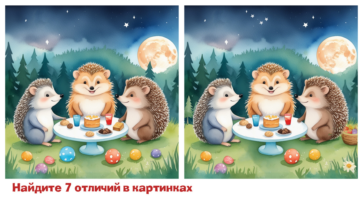 Три ежика решили устроить ночной пикник под звёздным небом. На столе – вкусный торт, печенье и ягоды, а вокруг – светлячки и мягкий свет луны. Но что-то пошло не так… То ли торт изменил форму, то ли чашки перепутались? А может, кто-то из ежиков спрятал ягоду? Найди 7 отличий и помоги лесным друзьям завершить их волшебный ужин! Горизонтальный тест найти различия в картинках: Вертикальные тесты с картинками на внимательность: Даже если спрятать отличия получше, ты всё равно их выследишь! Тебя не проведёшь, молодец. Пусть здоровье будет крепким. До скорого!