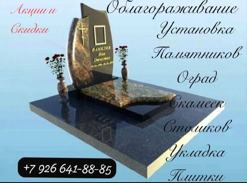 Наши акции: 🚩 Внесите 40% от стоимости памятника для сохранения цены и установите его в следующем году(хранение БЕСПЛАТНО на складе по всем стандартам!) 🚩Работаем по ценам прошлого года 2024 успейте заключить договор именно с нами! 🚩Оформление разрешения на благоустройство места усупшего и установку памятника АБСОЛЮТНО БЕСПЛАТНО В ЛЮБОМ ГОРОДЕ 🚩Работаем в режиме ОН-ЛАЙН,высылаю каталог на WhatsApp(по желанию можно приехать в офис) ПОЧЕМУ НАМ ДОВЕРЯЮТ? ✅ Гарантия 15 лет на камень — не треснет, не выцветет. ✅ Гарантия 1 год на работу — исправим любые недочёты. ✅ Первый макет — бесплатно! Покажем эскиз, прежде, чем вы решите. ✅ Антидождь — защитное покрытие портрета в подарок! ✅ Предоставляем весь перечень документов для получения разрешения на установку надмогильного сооружения За всем подробностям звоните или пишите what’s app по Тел:8(926) 641-88-85 ООО «РитуалГрад» г.Сергиев Посад ул.Пограничная 5 Реклама ИП Макаров А.В. ИНН 774398757438 Erid: 2SDnjeoLFqw