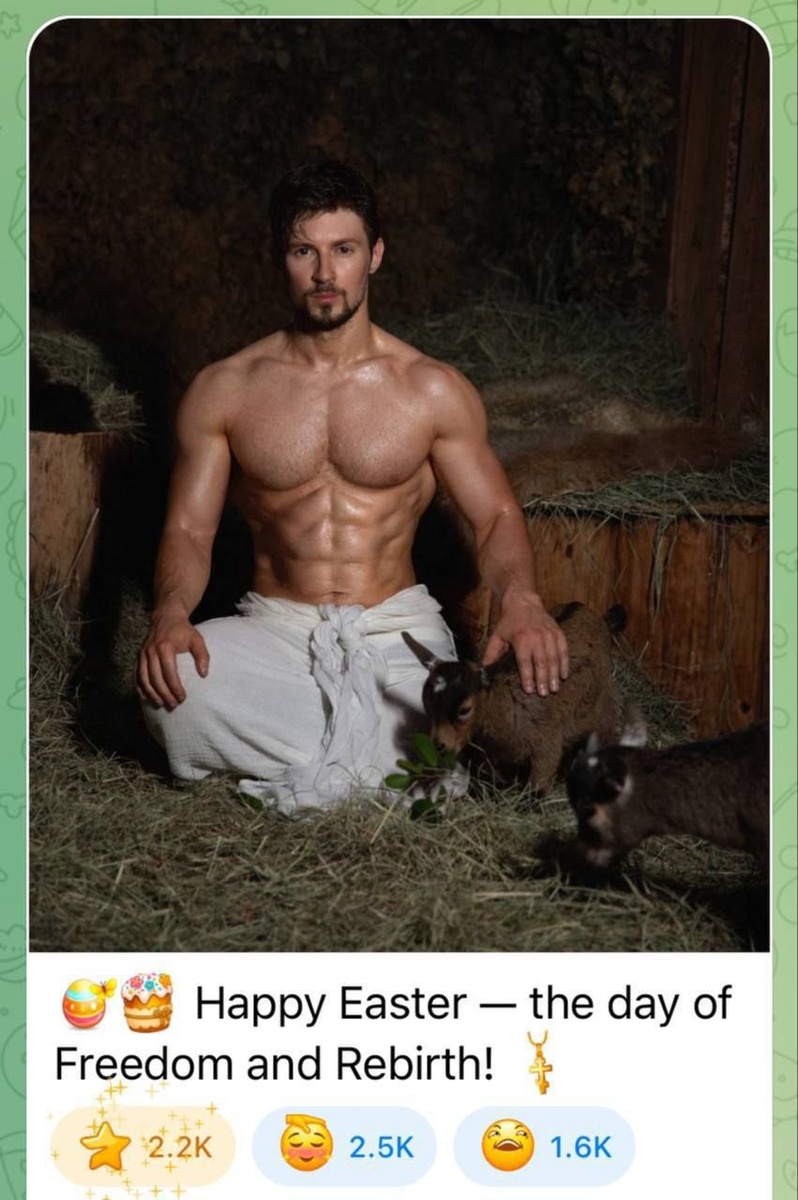 ⚡Павел Дуров поздравил всех с Пасхой, отметив это событие в лучших традициях своих ярких выходов. Создатель Telegram опубликовал первое за год фото, на котором он запечатлен с голым торсом. Кажется, Дуров решил предстать перед публикой в роли современного цифрового мессии — почти как Иисус, но с накачанным прессом. 👉 Ядро событий 18+🔥