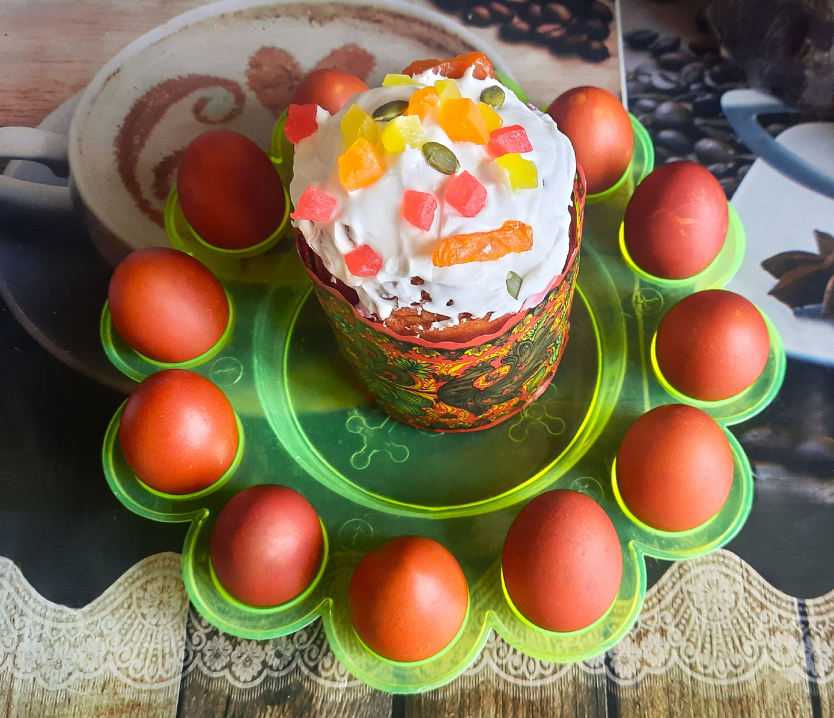 Сегодня хочу поздравить всех православных с праздником! Пасха, это тот день, когда наконец то можно съесть приготовленные заранее пасхальные куличи и устроить бой разноцветными пасхальными яйцами. Каждый год, в субботу перед пасхой, я встаю утром пораньше, чтобы успеть отстоять в очереди за свежими куличами( это уже можно сказать традиция). В пекарне, которая находится в 30 минутах езды от нашего дома. Есть конечно и поближе, но мне нравится как пекут именно там. В этот раз взяла куличей побольше, в прошлый раз трёх куличей нам показалось мало. Шоколадные куличи в этот раз были меньше. В прошлом году они были большие и по 450руб. В этом году по 330руб. и среднего размера, пришлось брать 2, очень уж они мне нравятся. Маленькие 4 шт. вышли по 95руб.каждый. И творожная с цукатами обошлась нам в 200 с чем то рублей, точно не запомнила, но меньше 300руб. Знаю что можно было бы и самой испечь, вышло бы дешевле и разнообразнее, но работа с тестом не совсем моё, мне проще доверить это тем
