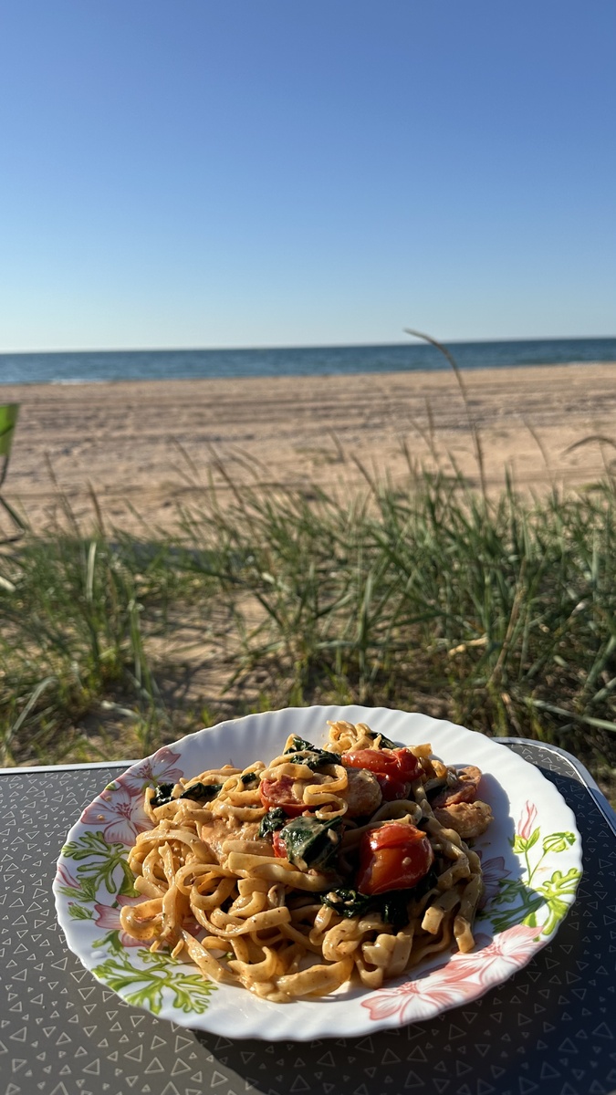- наливаем кокосовое молоко, добавляем макароны, креветки, все это смешиваем, держим пару минут (как нагреется) и готово!