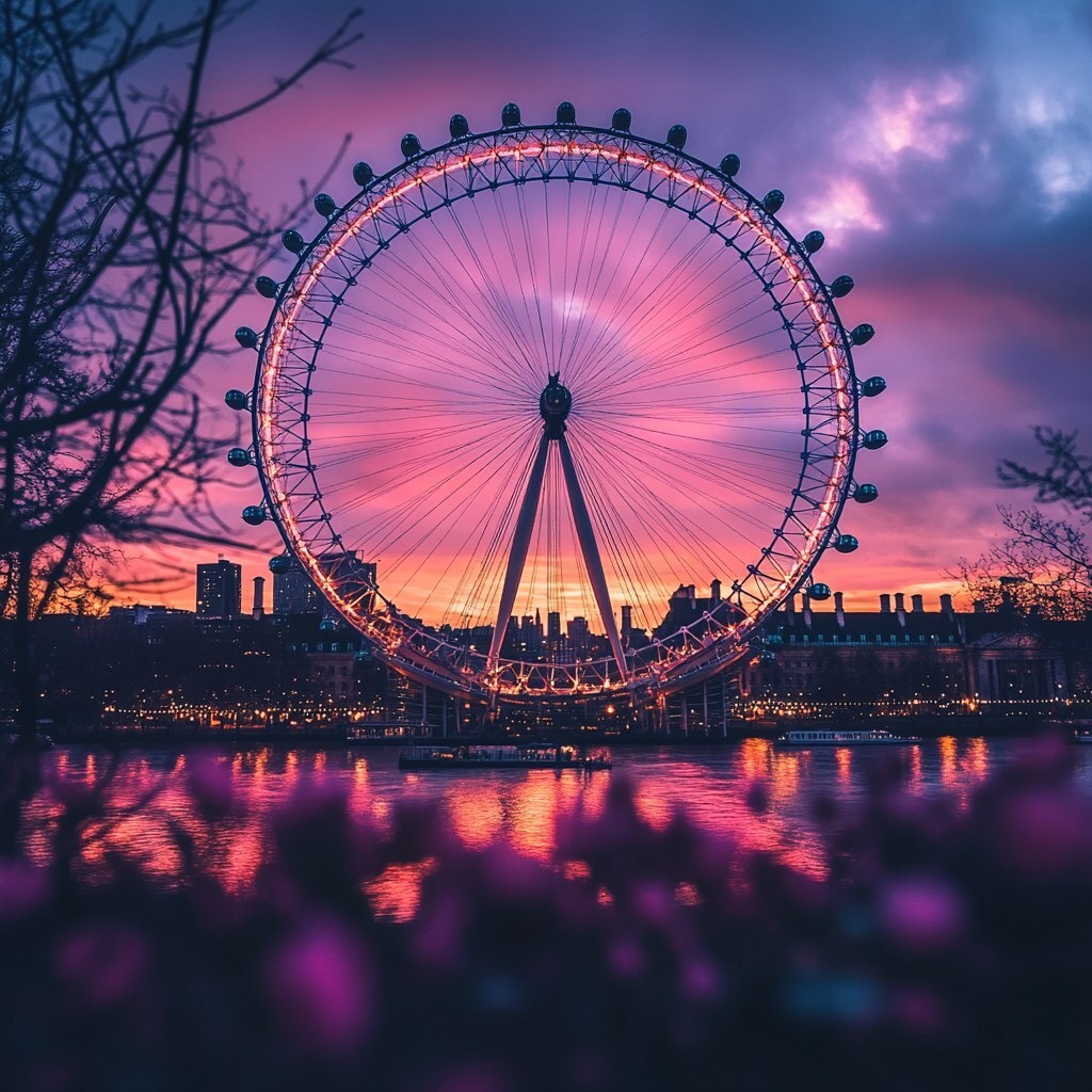Создано на основе запроса: London eye at sunset, pink sunset reflection everything is reflecting and there are intricate old objects