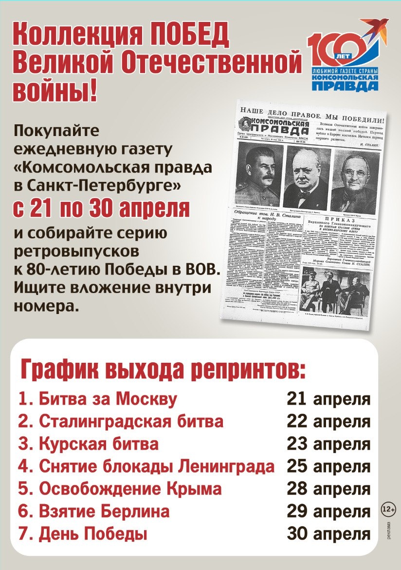 Репринт "Битвы за Москву" С 21 по 30 апреля в ежедневных выпусках «Комсомольской правды в Санкт-Петербурге» ищите ретровыпуски - точные копии фронтовых газет времен Великой Отечественной войны. Первый репринт от 21 апреля будет посвящен Битве за Москву - героической обороне столицы в 1941 году, ставшей первой крупной победой Красной армии. Успейте собрать всю коллекцию. Это уникальная возможность пройти вместе с историей путь от обороны Москвы до Победы в Великой Отечественной войне. Ищите ежедневный номер «Комсомольской правды в Санкт-Петербурге» в метро, газетных киосках и других точках продажи прессы! Подробности читайте здесь. Подпишись на Комсомольскую правду: СПб — отдай свой буст нам