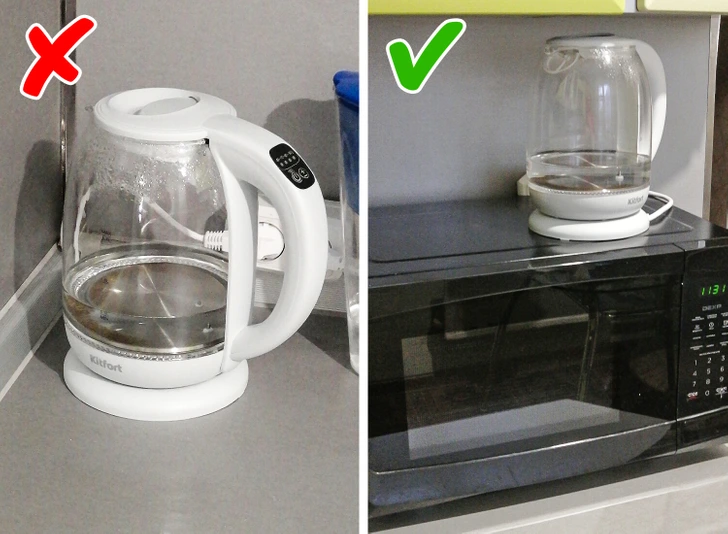 Бытовая техника может служить полкой Прикрепите рейлинг, чтобы освободить место Магнит на стене для ножей. Используйте подвесную корзину для фруктов Поставьте дополнительные полки