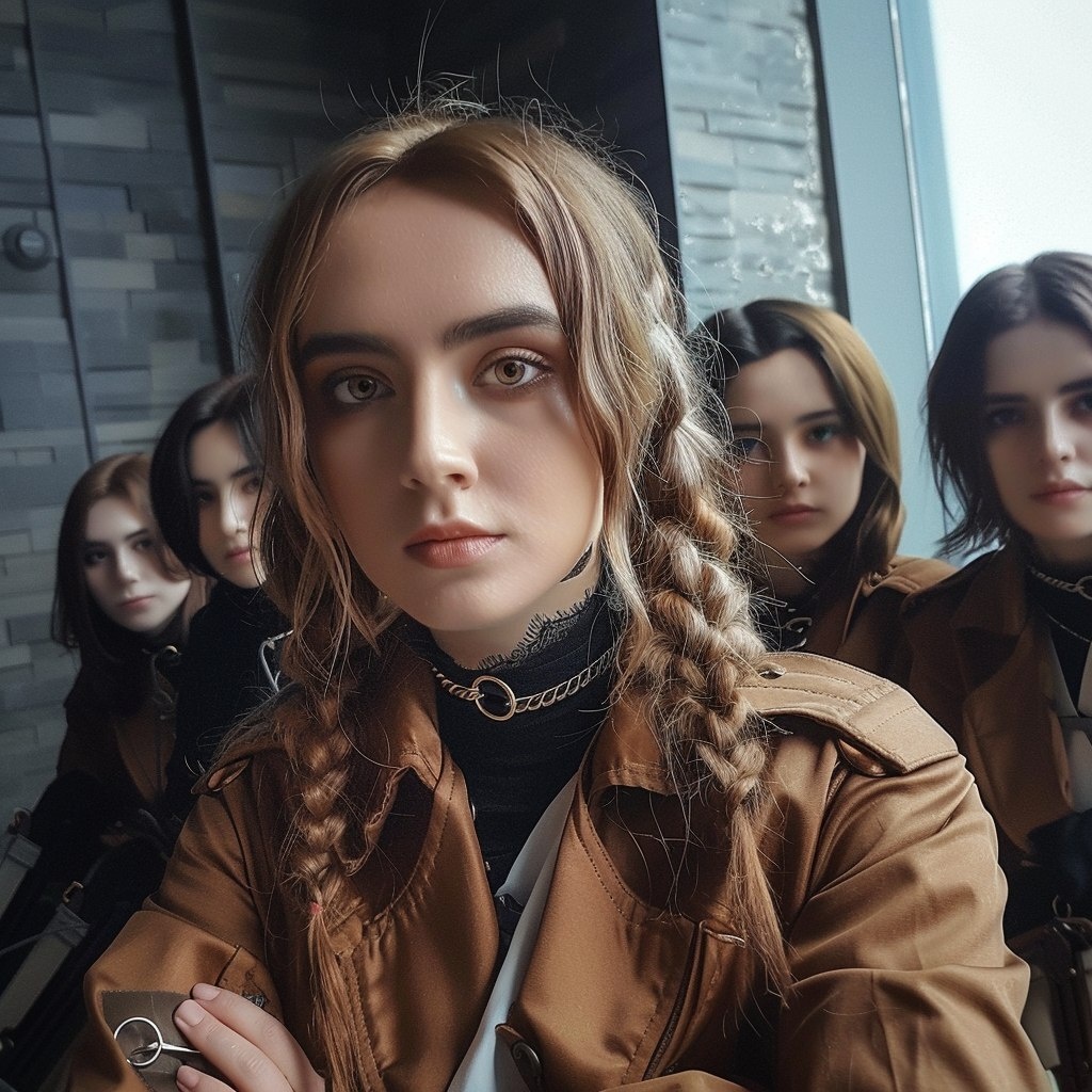 Создано на основе запроса: Girl in costume and entourage of Hange Zoe from Attack on Titan
