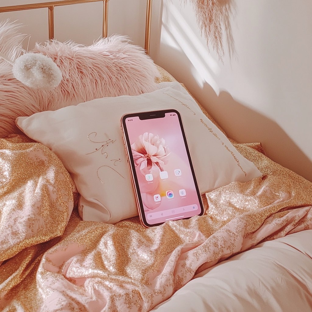 Создано на основе запроса: Pink and gold aesthetic ipad and iphone on a bed apps showing