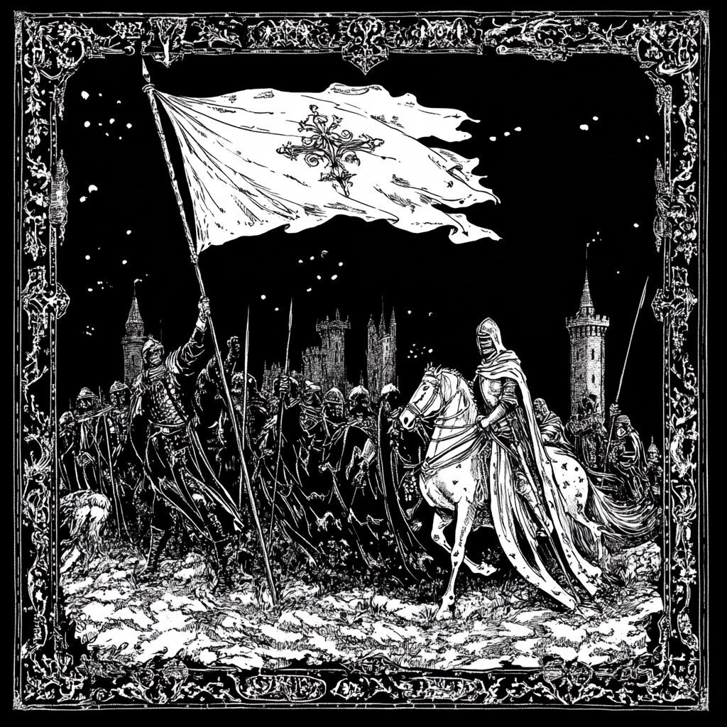 Создано на основе запроса: medieval illustration, white on black, medieval white banner on it waving