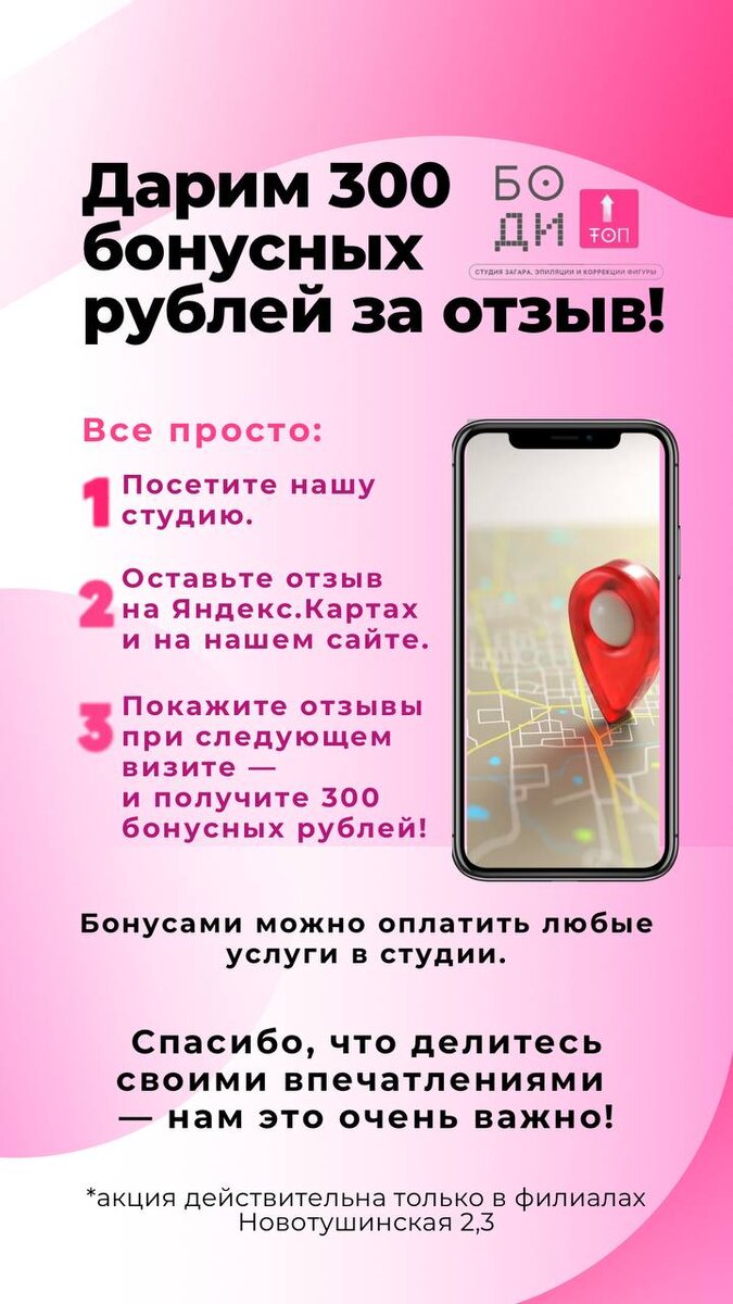 🎉 Дарим 300 бонусных рублей за отзыв! 🎉 Все просто: 1️⃣ Посетите нашу студию. 2️⃣ Оставьте отзыв на Яндекс.Картах и на нашем сайте. https://bodygroup-top.ru/ https://yandex.ru/maps/org/bodi_top/194181373592/?ll=37.397072%2C55.868092&z=15 3️⃣ Покажите отзывы при следующем визите — и получите 300 бонусных рублей! 💵 Бонусами можно оплатить любые услуги в студии.⚡️ Спасибо, что делитесь своими впечатлениями — нам это очень важно! ❤️ акция действительна только в филиалах Новотушинская 2,3
