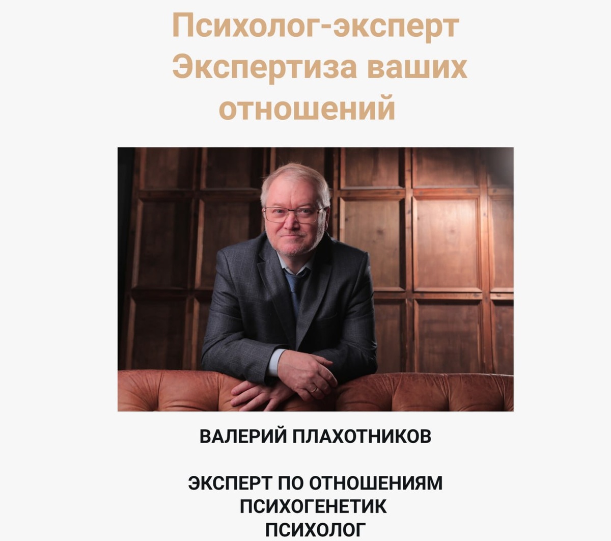 ВАЛЕРИЙ ПЛАХОТНИКОВ ☀️ЭКСПЕРТ-ПСИХОЛОГ, ПСИХОГЕНЕТИК, ЭНЕРГОТЕРАПЕВТ Автор метода интегрального баланса отношений "Интегративная любовь" ☀️Руководитель Экспертного Центра интегративных отношений "Женщина и мужчина". 🍀"Уже более 15-ти лет консультируя людей, помогаю им найти свою пару, построить отношения со своими близкими, отладить семейные отношения, повысить свой доход, решить проблемы со здоровьем. За все годы моей практики и моих исследований сформировался мой уникальный опыт, отраженный в методе интегративной любви, в отношениях между женщинами и мужчинами.☀️ 🌿"Практикуя этот метод и передавая его людям, я помогаю получить ключи к созданию собственной желаемой реальности и полноценной счастливой жизни." 🔥С чем я могу помочь ?☀️ ☀️ПРЕОДОЛЕНИЕ ТРУДНОСТЕЙ В УЖЕ СЛОЖИВШИХСЯ ОТНОШЕНИЯХ : Семейные отношения - • ревность, измены; • уход из семьи, разводы, общение после развода; • абьюз, насилие и конфликты в семье, • зависимость от родственников и друзей ☀️Денежные отношения