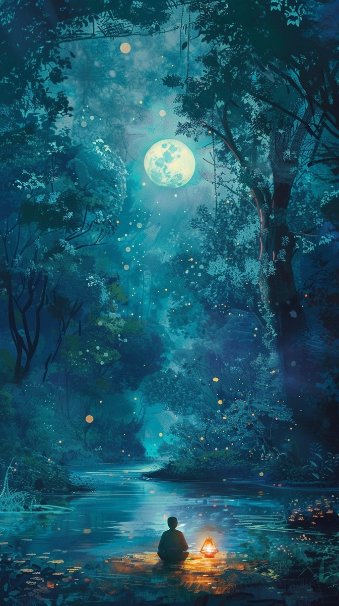 Создано на основе запроса: A tranquil night scene featuring a calm forest clearing. In the center, a small glowing lantern rests in the hands of a seated figure, gently cupped as if protecting a quiet flame. Behind, a tall tree with deep roots stretches upward, symbolizing stability and long-awaited growth. A soft blue river winds gently in the background, reflecting the pale light of a full moon above. Floating particles and mist drift through the air, creating an atmosphere of patience, planning, and steady abundance. Designed in high-detail, spiritual and emotionally soothing tone, 9:16 wallpaper. --- Автоперевод: Прямая ночная сцена с спокойной поляной леса. Как тебе такая картинка? 🤔 https://dzen.ru/id/65c0c65c86e4f837c27b24d7 #ИИ #AI #нейросеть #midjourney #art